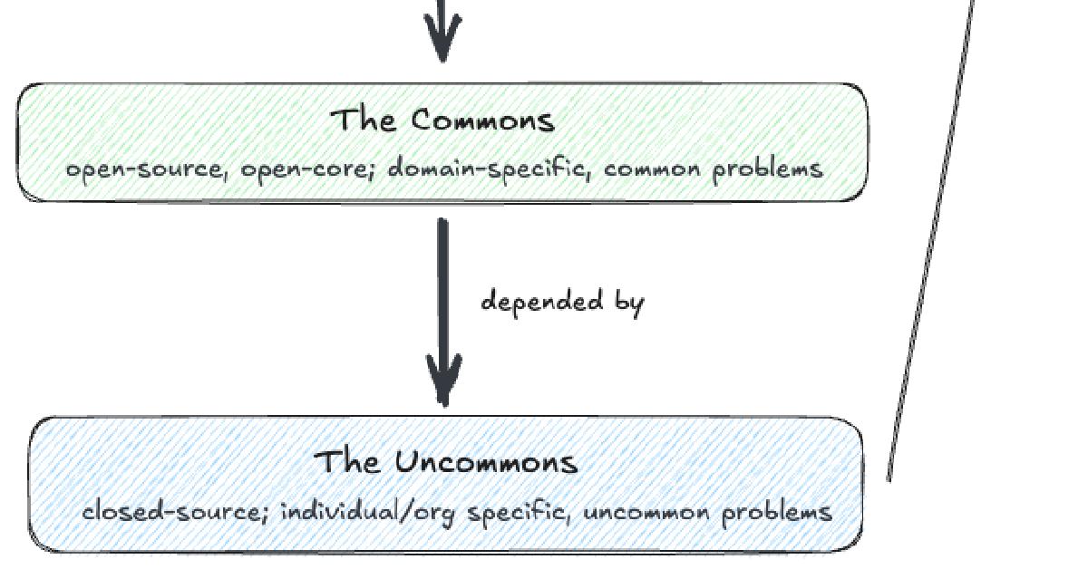 The key difference between the commons and the uncommons lies in the nature of the problems they solve. The commons layer addresses problems shared across a domain—problems whose boundaries often map to industry lines (oil and gas, finance, pharmacy, and so on). Contributors and users benefit from network effects: the more people use and improve the same codebase, the more valuable it becomes for everyone. This isn’t charity either. Every contribution reflects a cost-benefit calculation, whether explicit or intuitive: is it cheaper to privately fork and bear the full maintenance burden, or to contribute upstream and let the community carry the weight?